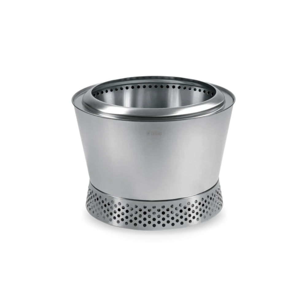 Tillverkad av rostfritt stål med en avsmalande design. Den består av en förbränningsenhet med dubbla väggar, bottenplatta, asklåda, sockel och toppring. Asklådan samlar upp all smuts, glöd och aska. Tillsammans med bottenplattan skyddar den också mot strålvärme på alla underlag. Dessutom finns det tillbehörsprodukter, som grillgaller, lock, gnistskydd och robust överdrag. Produkten har en diameter på 50 cm, en höjd på 37 cm och väger 6,7 kg. Färg: Rostfritt stål. Produkten levereras med sockel och asklåda.
