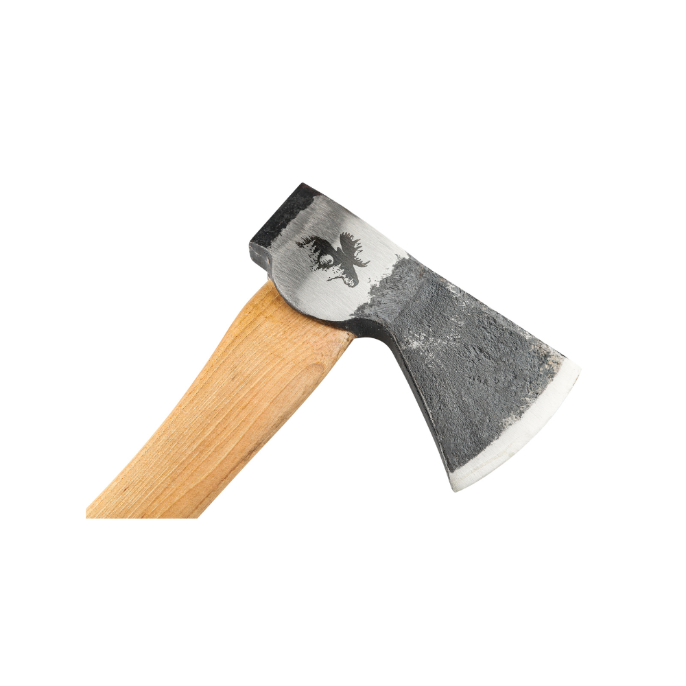 Det kraftiga stålbladet levererar effektiv huggkraft och håller skärpan länge, medan det greppvänliga handtaget i slitstarkt material ger säker kontroll även i kyla och snö. En skyddande eggskydd medföljer för säker transport i ryggsäck eller väska. Älg är graverad enligt bild.