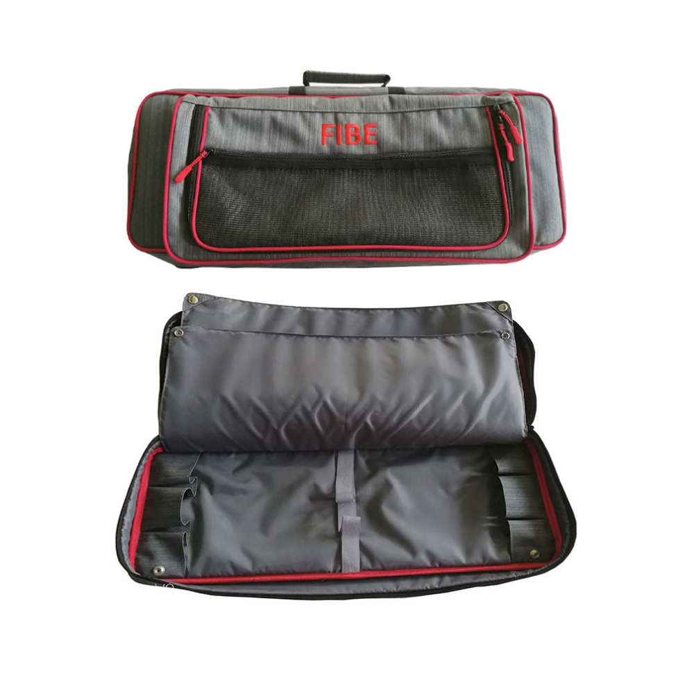 Avdelsningsfack i mitten så man kan förvara spön på båda sidor av väskan. Utvändig fick för diverse småplock m.m.